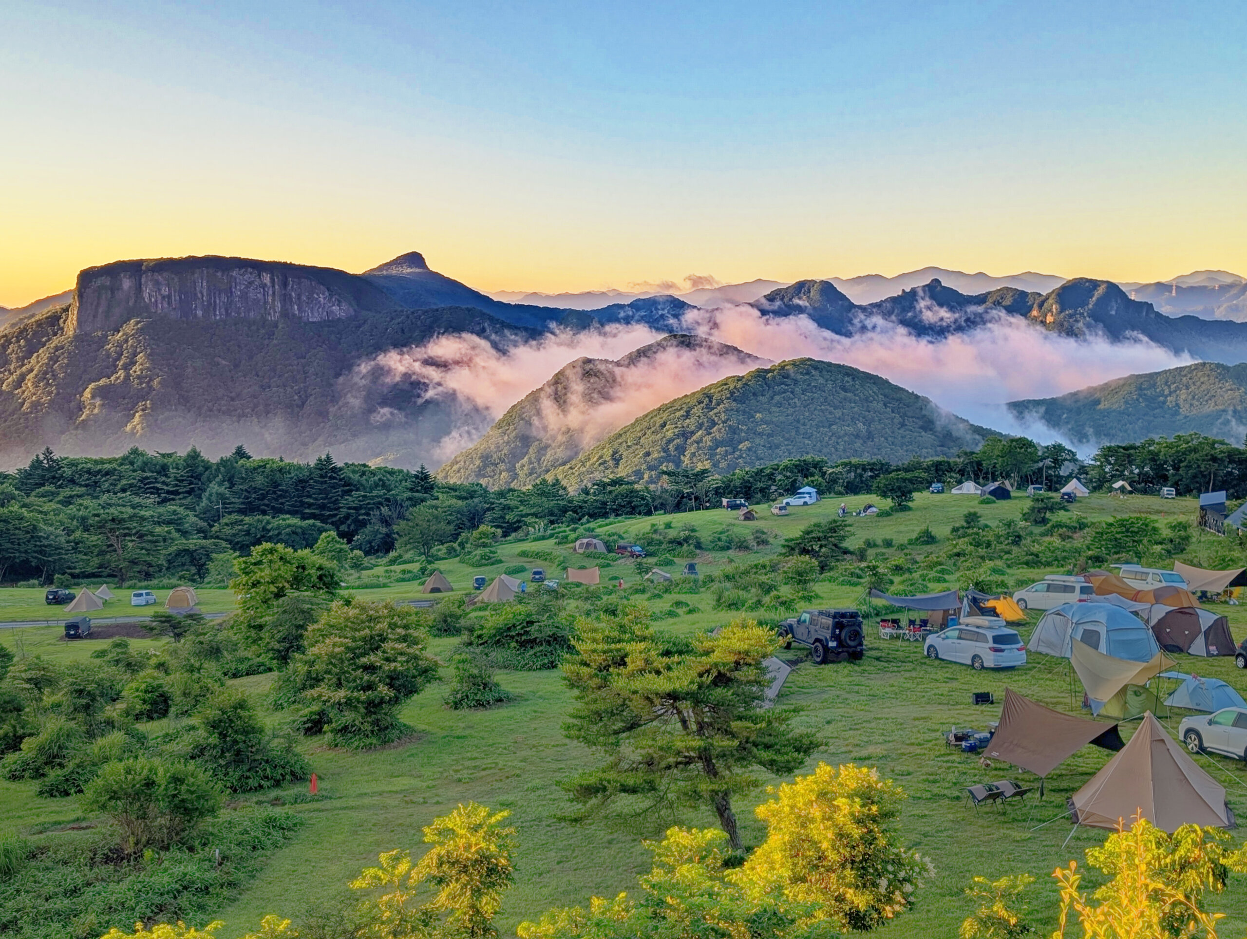 目覚めてまもない色付き始めたキャンプ場を、朝モヤから覗く荒船山が見守る様子に感動、早起きした甲斐がありました。