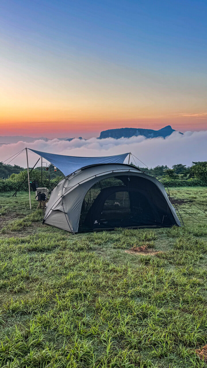 朝焼けのオレンジ色、そして空の青と荒船山の白い雲海のカラフルな朝に佇むテントの静寂感がとても素敵です。